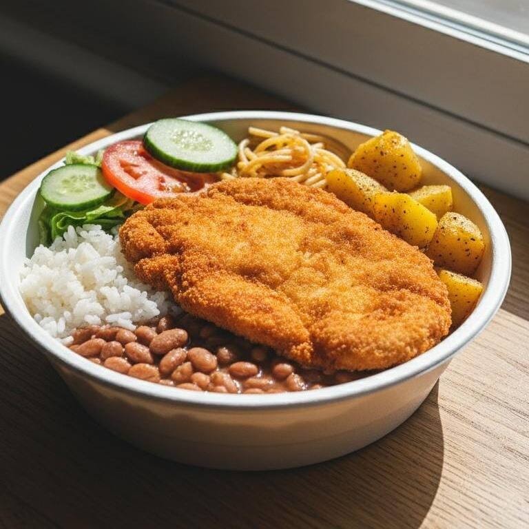 Delicioso! Bife a milanesa com acompanhamentos caprichado, arroz, feijão, macarrão, batata sóute e salada!