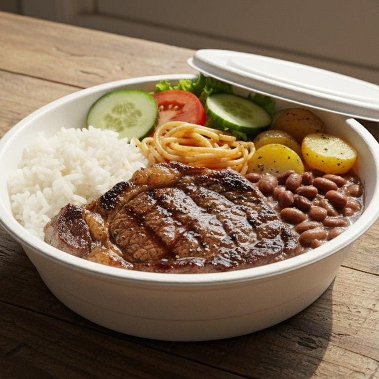 Bife Grelhado e acompanhantes caprichado, macarrão, batata sóute, arroz, feijão e salada