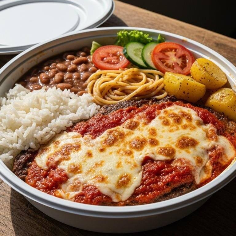 Suculento Frango a Parmegiana, com acompanhantes caprichado, arroz, feijão, macarrão, batata sóute e salada!