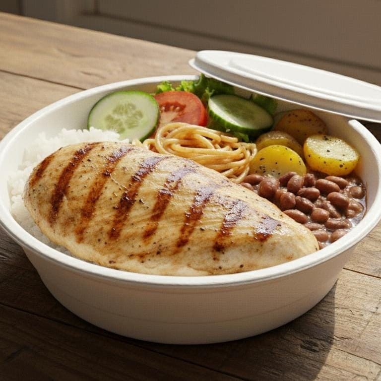 Frango Grelhado, com acompanhantes caprichado, arroz, feijão, macarrão, batata sóute e salada!