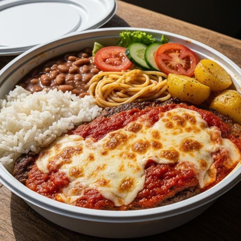 O clássico que nunca te deixa no vácuo. Parmegiana tão macio que parece ter sido treinada pelo Mestre Miyagi. Acompanhamentos caprichados pra fechar o combo digno de final de novela. Batata Sóute, macarrão, arroz, feijão e salada.