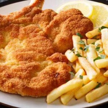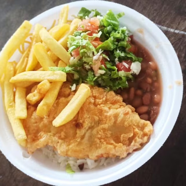 Arroz, feijão, batata frita, farofa e frango a milanesa