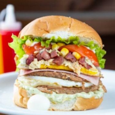 Pão, 2 hambúrgueres da casa, queijo cremoso, alface, tomate, 2 ovos, frango desfiado, bacon, milho, batata palha, 1 ovo de codorna e molho verde artesanal