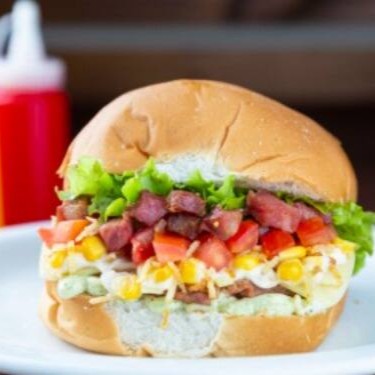Pão, hambúrguer da casa, queijo cremoso, alface, tomate, bacon em cubos, milho, batata palha, maionese e molho verde