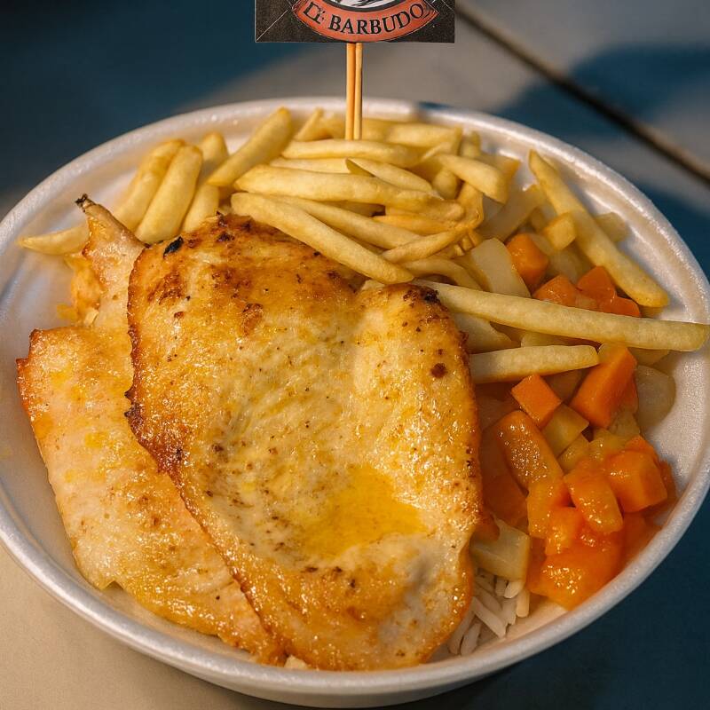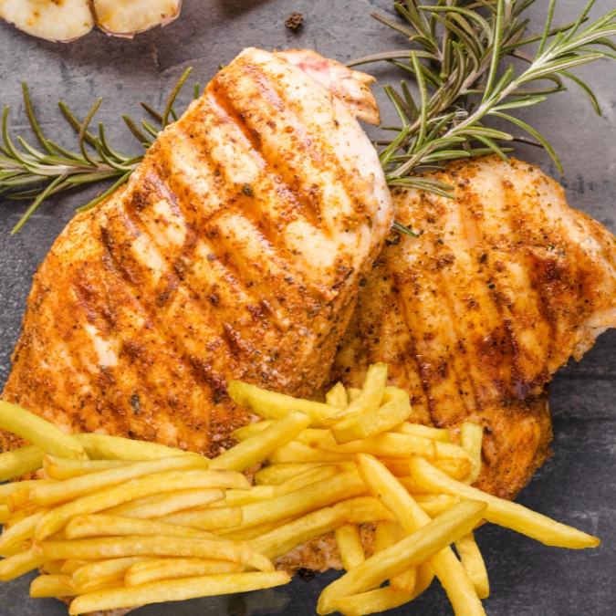 Frango grelhado Média: Acompanha arroz, feijão, macarrão, legumes do dia, batata frita e salada fresca + Chá copo