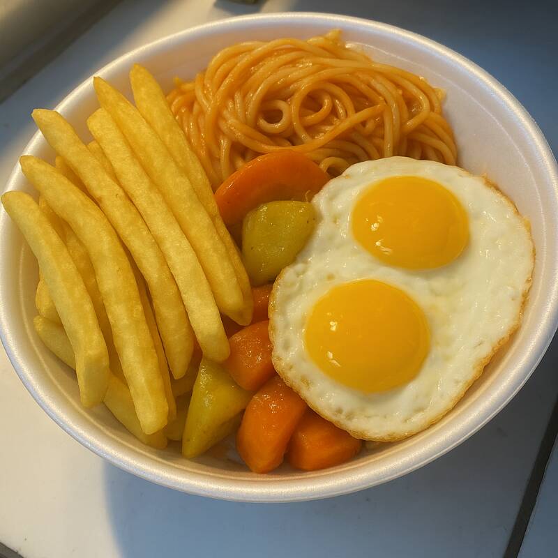 Arroz, feijão, macarrão, legumes do dia, batata frita e salada fresca