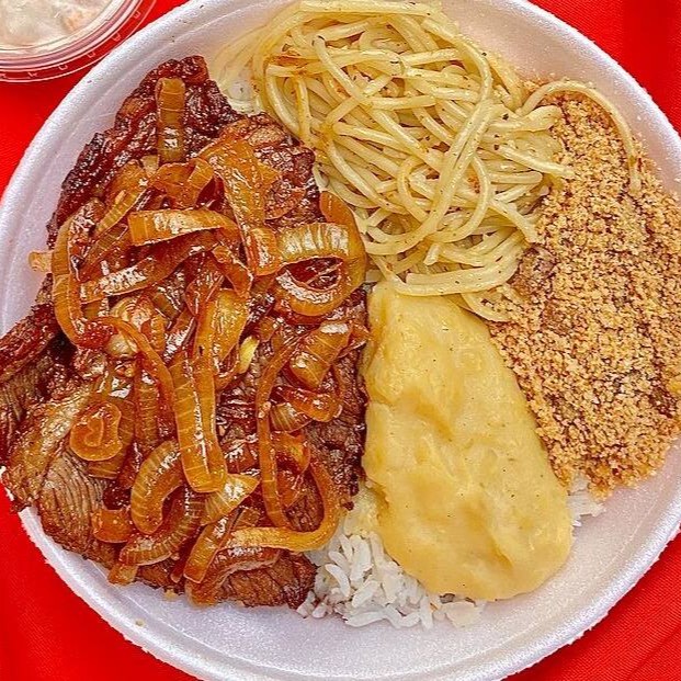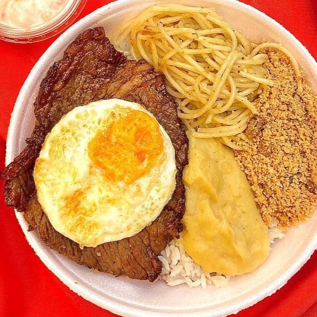 Bife suculento preparado no ponto certo com ovo perfeito Acompanha: Arroz soltinho, Feijao preto, massa do Dia, Purê, Farofa caseira temperada, Salada do Dia Á Parte. E maionese a parte ! - comida caseira - marmita