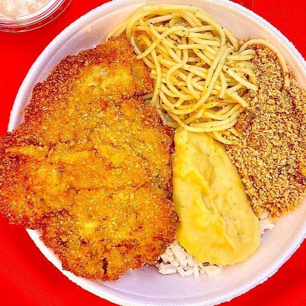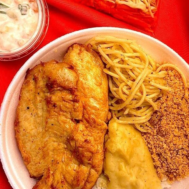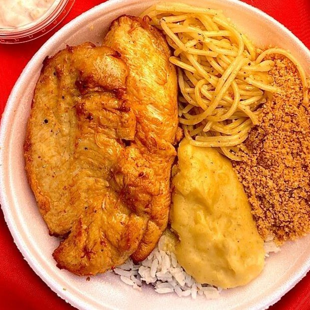 Acompanha: Arroz, feijão, massa do Dia, Farofa , purê e Salada do Dia e maionese Á Parte.