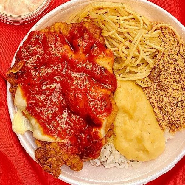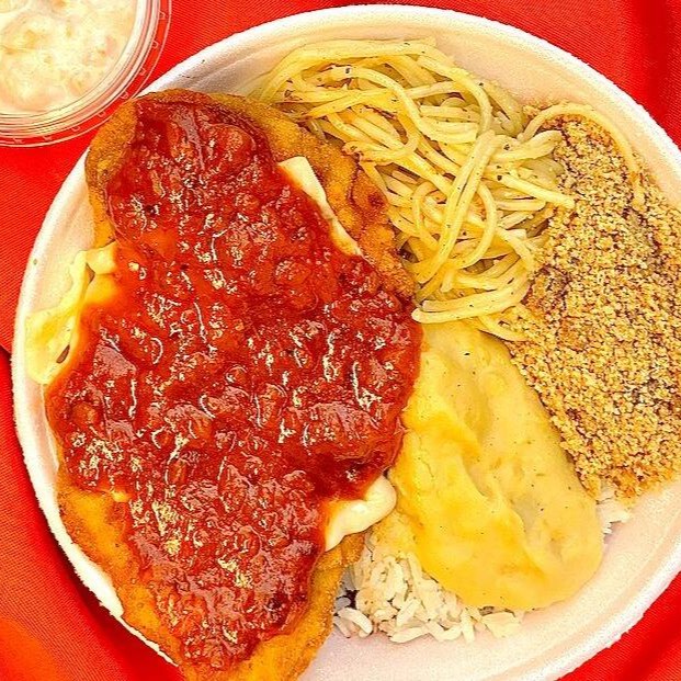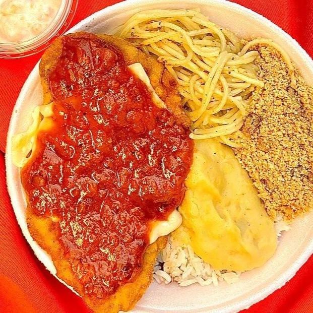 Filé de frango empanado, coberto com molho de tomate caseiro, queijo derretido e temperos especiais da chef , criando uma combinação clássica e irresistível. Acompanha: Arroz soltinho, Feijao preto, massa do Dia, Purê, Farofa caseira temperada, Salada do Dia e maionese Á Parte.