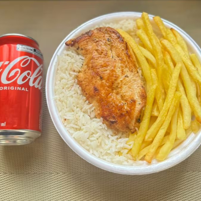 Marmita com delicioso filé de frango grelhado acompanhado de arroz branco, feijão e batatas fritas. Acompanha refrigerante lata Coca Cola 350ml bem gelada. Marmita indicada para 01 pessoa.