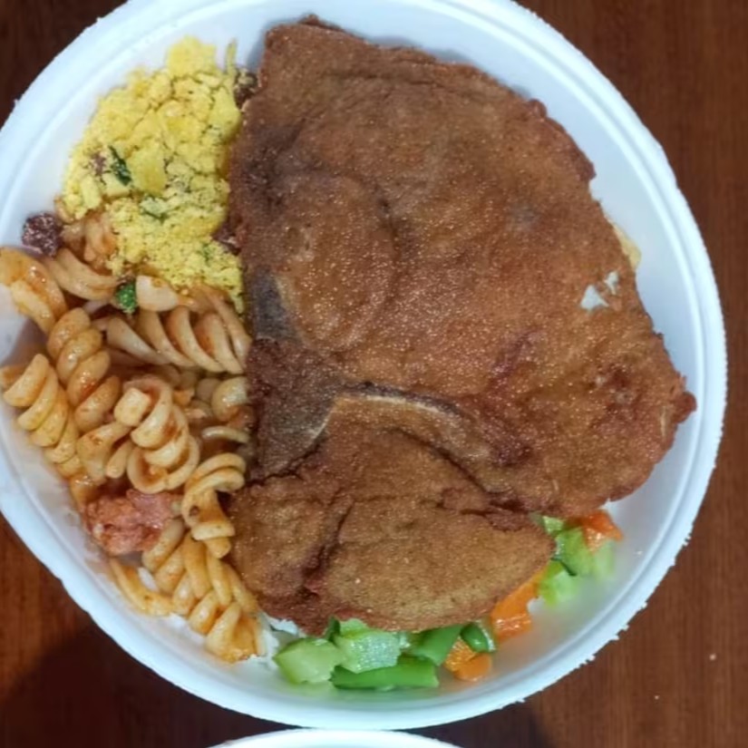 Acompanha ; Arroz , feijão , macarrão, farofa , legumes refogados , salada e uma fritura variada.