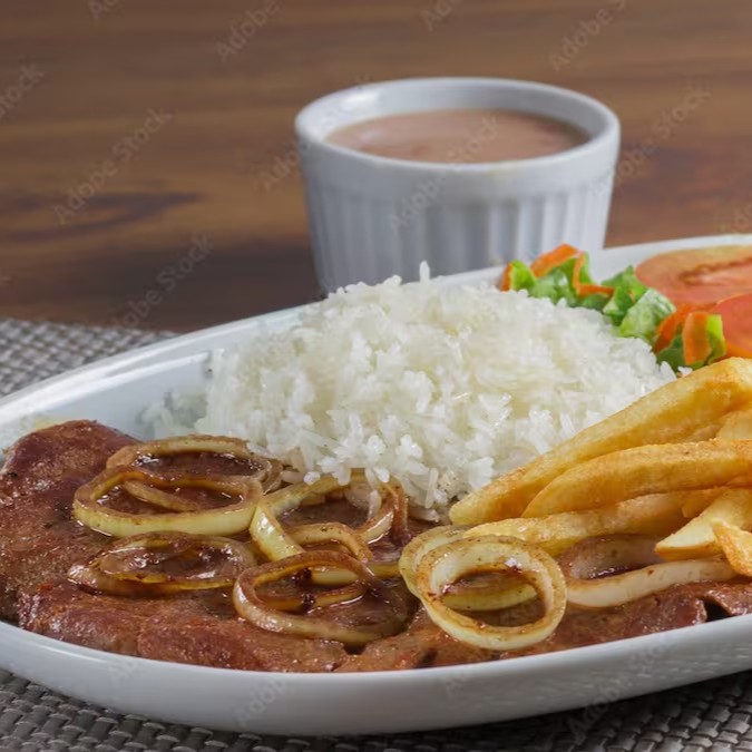 Bife acebolado acompanhado de arroz, feijão carioca farofa e fritas.