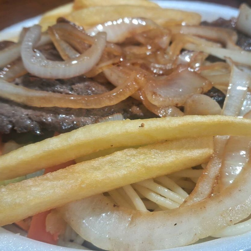 Marmita G - Bife Acebolado Com Arroz, Feijão, Macarrão, Farofa E Fritas