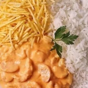 Acompanha ; arroz, strogonoff de frango, batata palha