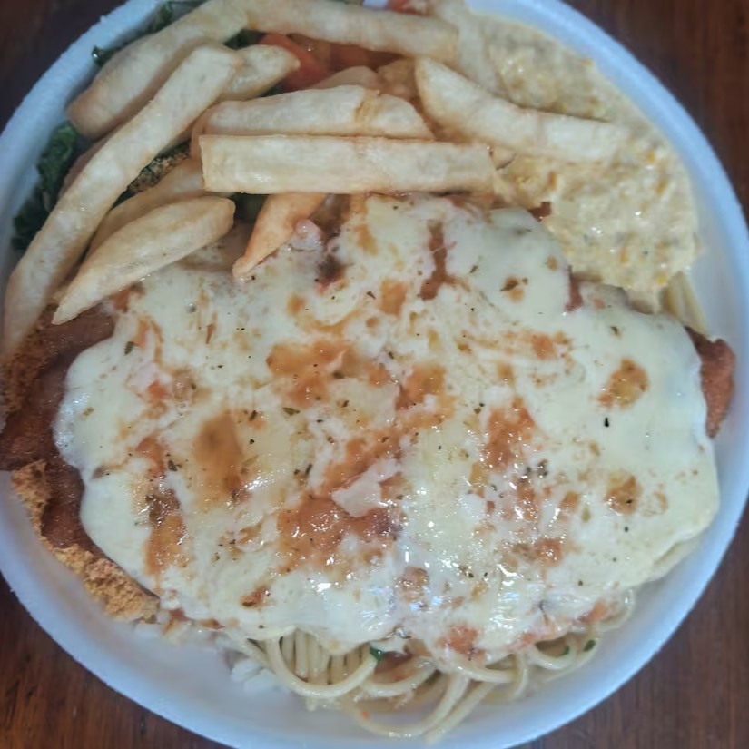 Combo com 2 Marmitas tamanho P. Primeira Frango Parmegiana Arroz, feijão, macarrão do dia, farofa, legumes refogados e uma fritura variada & Segunda Bife Parmegiana Arroz, feijão, macarrão do dia, farofa, legumes refogados e uma fritura variada