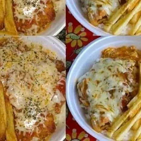 Marmita com delicioso filé de frango parmegiana (empanado na massa crocante coberto com molho de tomates e queijo) acompanhado de arroz branco e batatas fritas. Marmita indicada para 01 pessoa.
