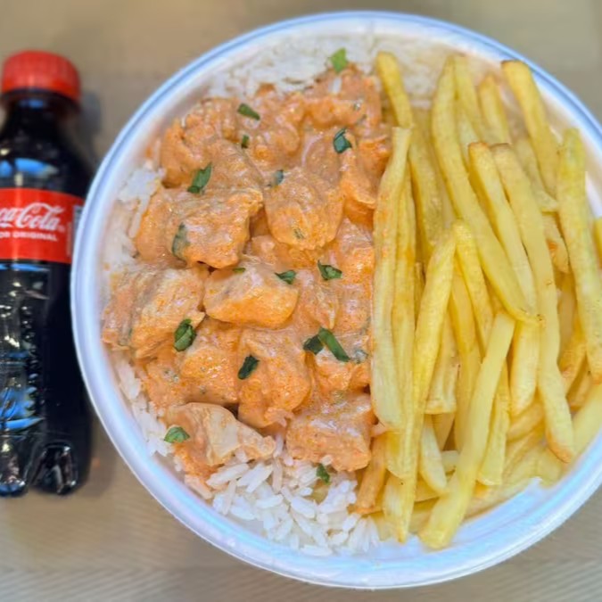 Marmita com delicioso filé de frango ao molho estrogonofe acompanhado de arroz branco e batatas fritas. Acompanha refrigerante pet Coca Cola bem gelado. Marmita indicada para 01 pessoa.