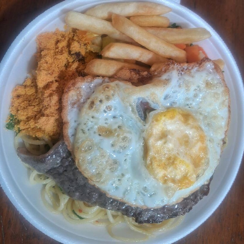 Marmita P - Bife A Cavalo Com Arroz, Feijão, Macarrão, Farofa E Fritas