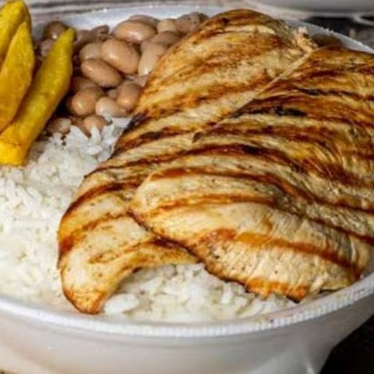 Marmita com delicioso filé de frango grelhado acompanhado de arroz branco, feijão e batatas fritas. Marmita indicada para 01 pessoa.