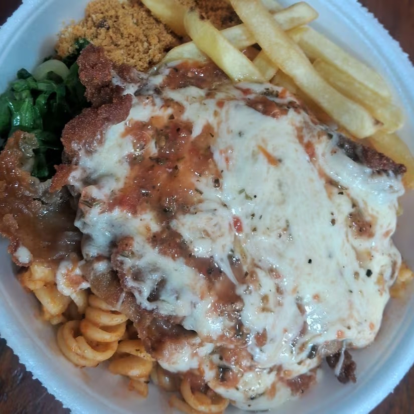 Marmita P - Bife A Parmegiana Com Arroz, Feijão, Macarrão, Farofa E Fritas