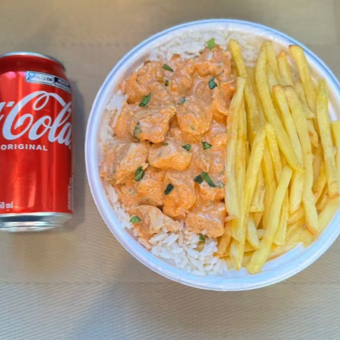 Marmita com delicioso filé de frango ao molho estrogonofe acompanhado de arroz branco e batatas fritas.. Acompanha refrigerante lata Coca Cola 350ml bem gelada. Marmita indicada para 01 pessoa.