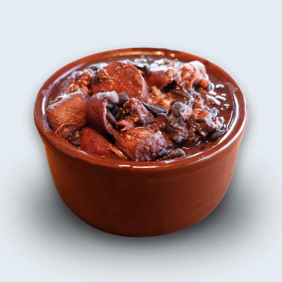 Porção de feijoada leve (linguiça, costelinha de porco, paio e charque), enviada em embalagem plástica lacrada. Disponível em duas opções de tamanho com aproximadamente 400g ou 900g.