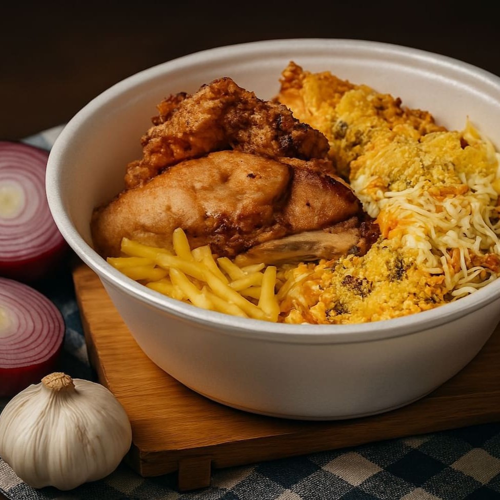 Arroz branco leve e macio, feijão branco cremoso ou feijão preto robusto para completar a base do prato, adicionado um toque de sabor com farofa crocante, adicionando textura e profundidade a cada garfada. Aproveite o acompanhamento do Dia 1 pedaço delicioso da carne do dia! , normalmente o frango é frito mas devido a demanda do Dia pode ser assado preparado com ingredientes frescos e sazonais. Prato com aproximadamente 250 a 300gr. Caso não seja informado o feijão a sua escolha, será montado a marmita de acordo com a disponibilidade do feijão do Dia!