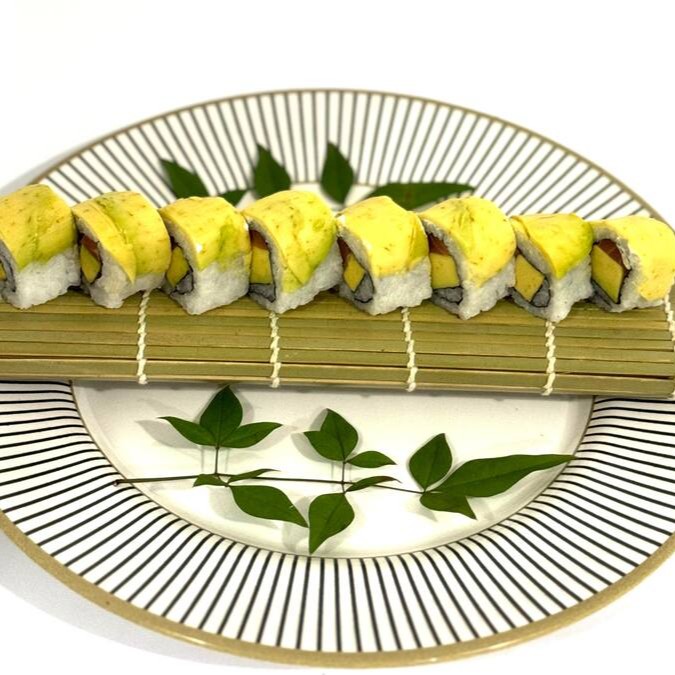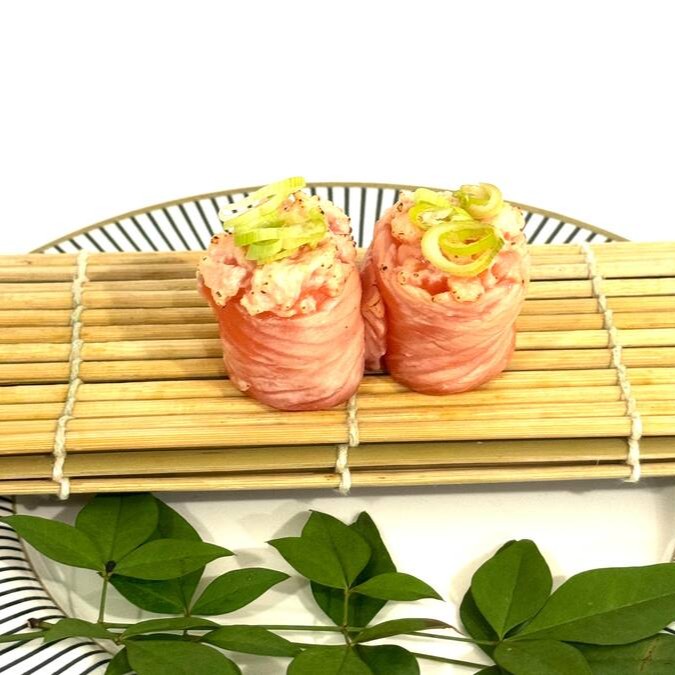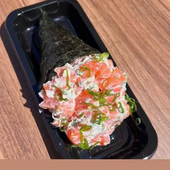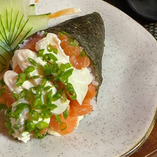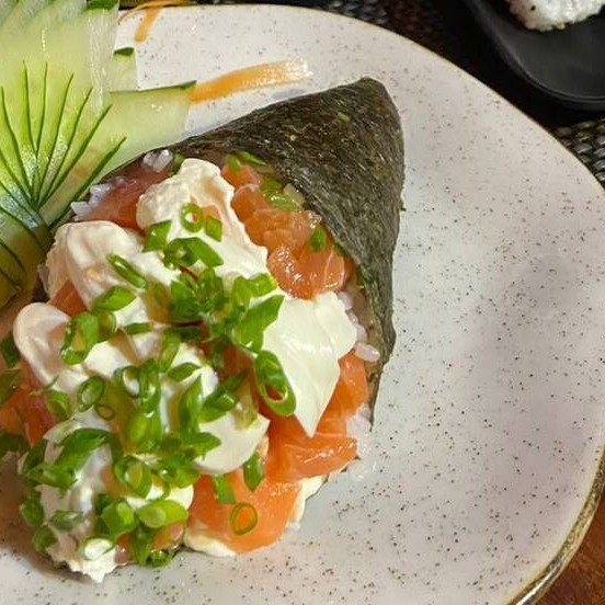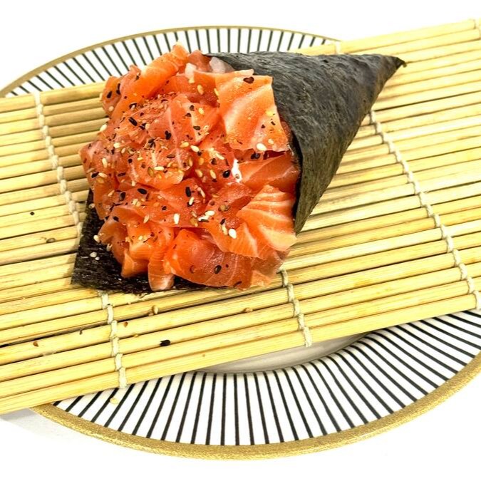 70g de shari (arroz japonês), patê de Salmão, creme cheese, nori, gergelim e cebolinha.