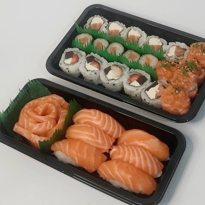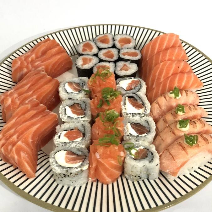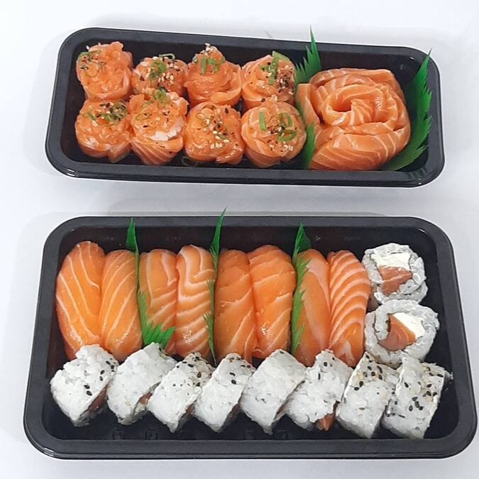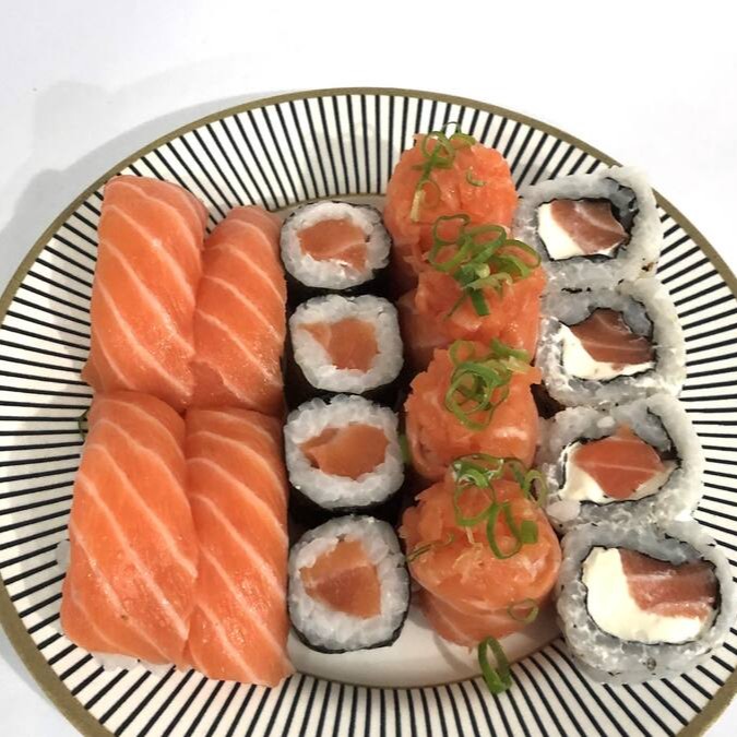 8 Uramaki Filadélfia, 4 Hossomaki de Salmão, 4 Joe de Salmão, 2 Niguiri de Salmão e um temaki de Salmão Filadélfia (médio).