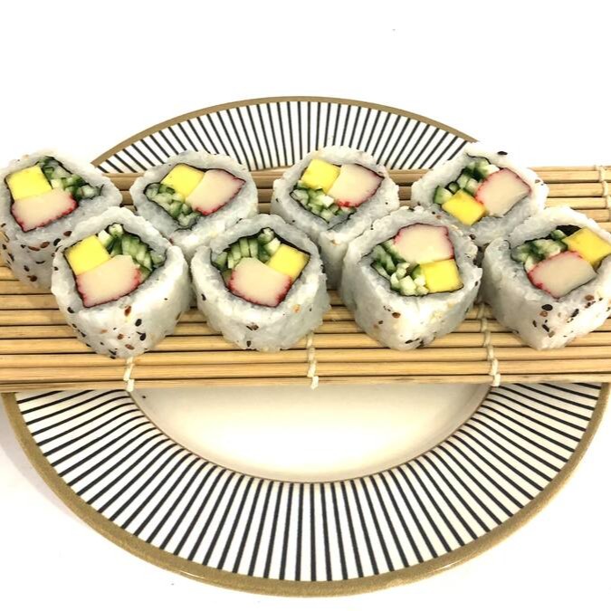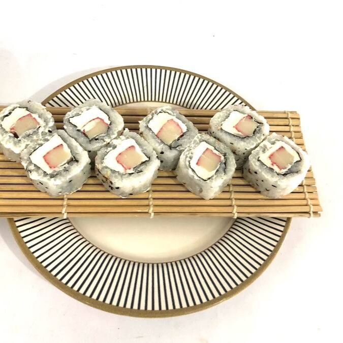 100g de shari (arroz japonês), 45g de salmão, creme cheese, nori e gegelim.