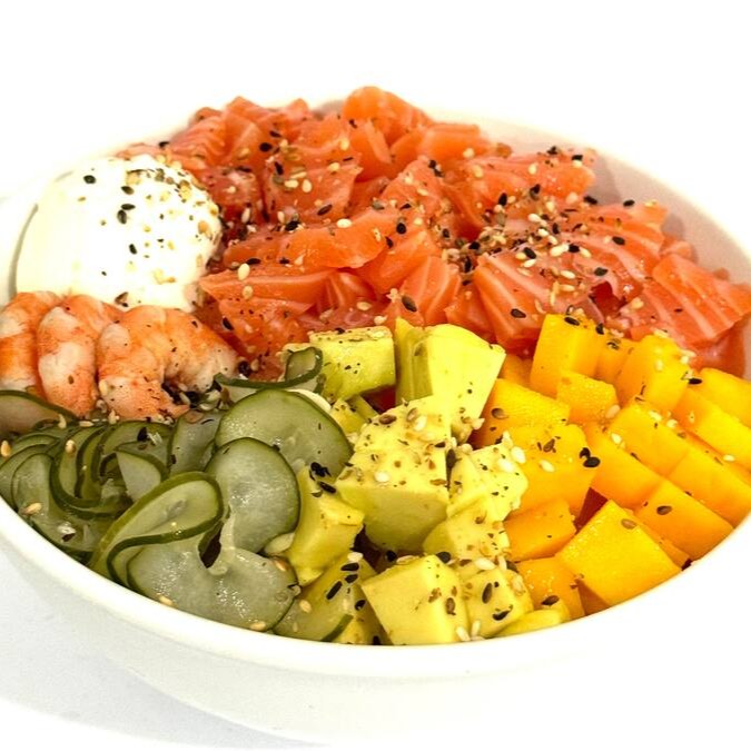 Cubos de Salmão, Abacate, Manga, Cream Cheese e Sunomono.