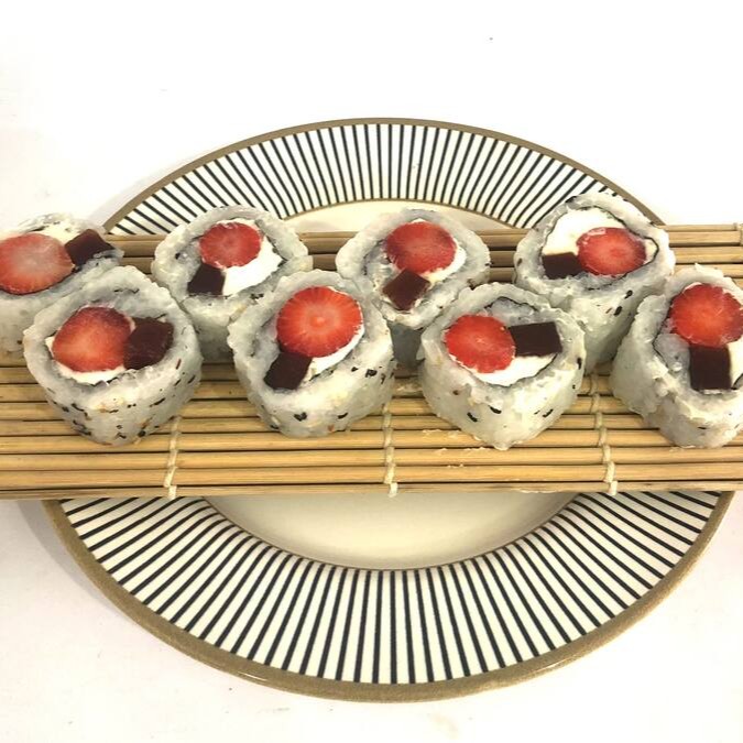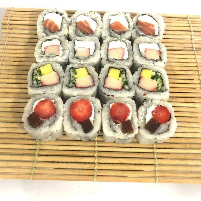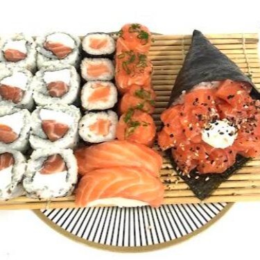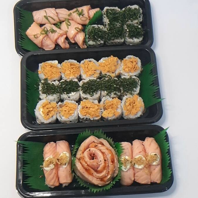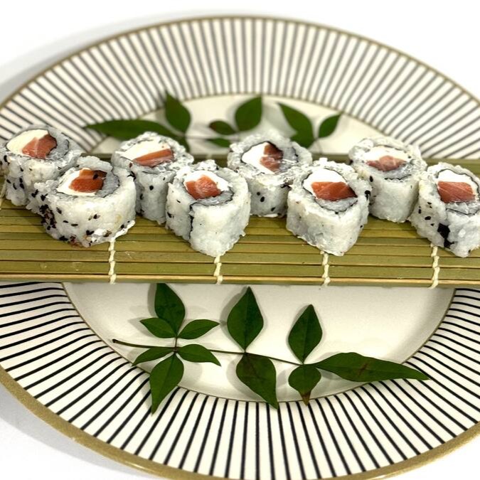 70g de shari (arroz japonês), 30g de salmão em cubos, creme cheese, nori e gergelim.