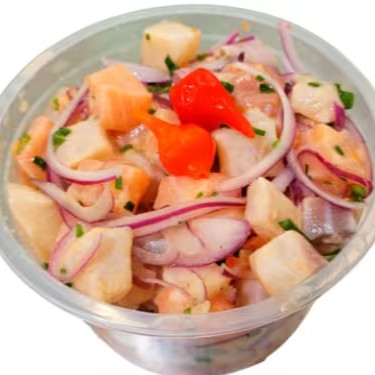 Salmão e Tilápia em Cubos, Cebola Roxa, Cebolinha, Ajinomoto, Gergelim, Suco de Limão e Sal.
