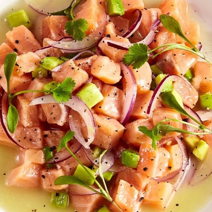 Salmão em Cubos, Cebola Roxa, Cebolinha, Ajinomoto, Gergelim, Suco de Limão e Sal.