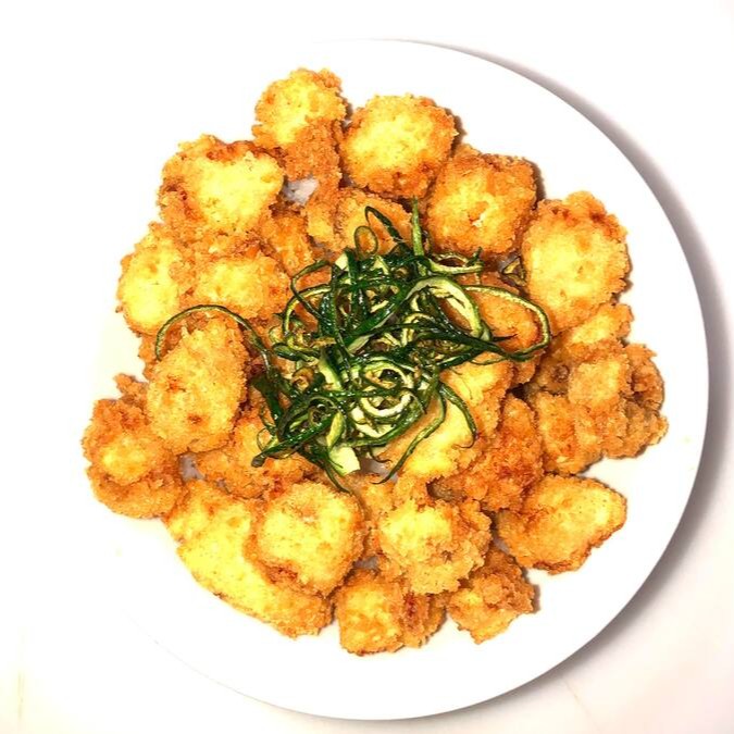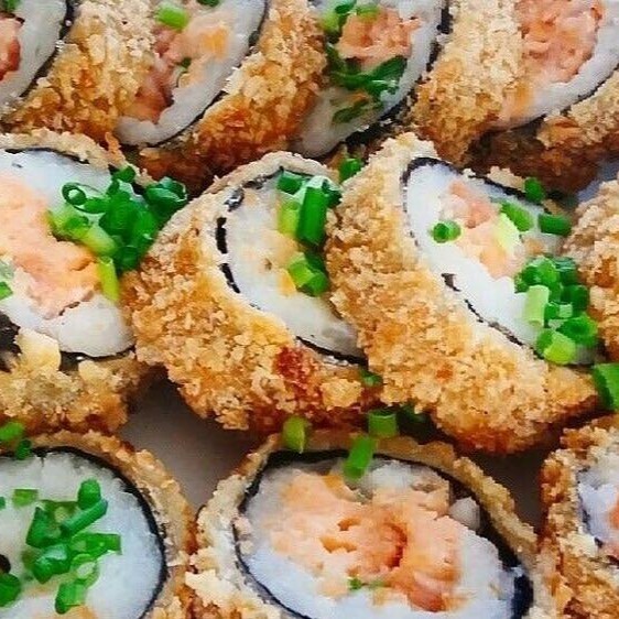 Temaki empanado na farinha panko, recheado com salmão batido, crean cheese e cebolinha.