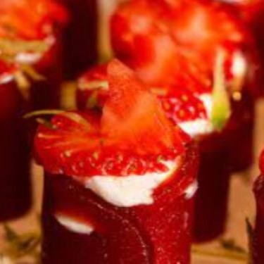 Fatia Fina de Goiabada, Cream Cheese, Limão, Morango e Cobertura de Morango.
