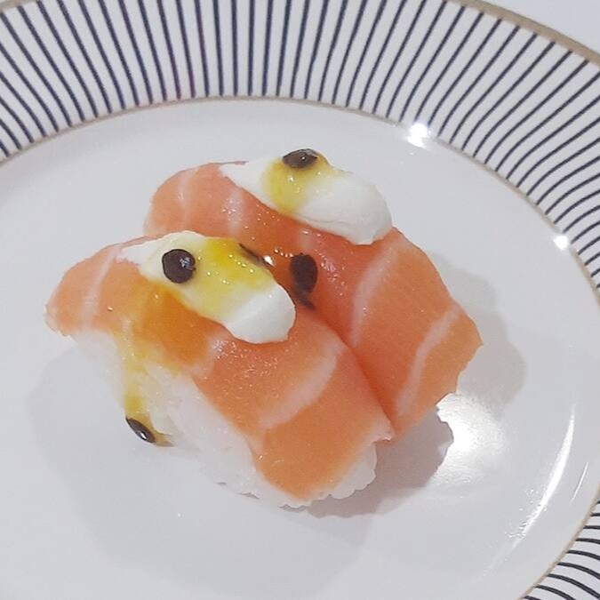 Arroz revestido com fatia fina de salmão maçaricado, com cobertura de geleia de maracuja.