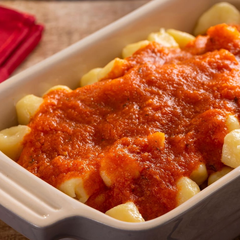 Massa de nhoque de batata, molho artesanal ao sugo, finalizado com parmesão ralado. Embalagem para forno 25 minutos, 180 Pode tirar da embalagem e aquecer em micro. Serve 3 a 4 pessoas.