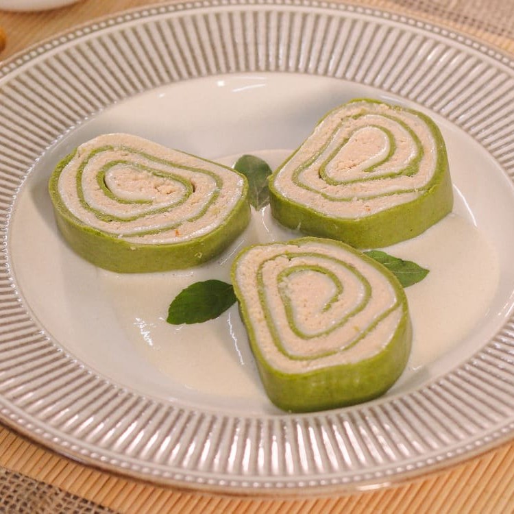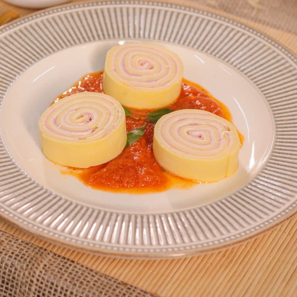 Massa de rondelli enrolada, recheado com presunto e queijo. Acompanhado de molho ao sugo. Embalagem para forno 25 minutos, 180 Pode tirar da embalagem e aquecer em micro. 6 fatias de rondelli. Aproximadamente 800g à 1kg. Serve 2 à 3 pessoas.