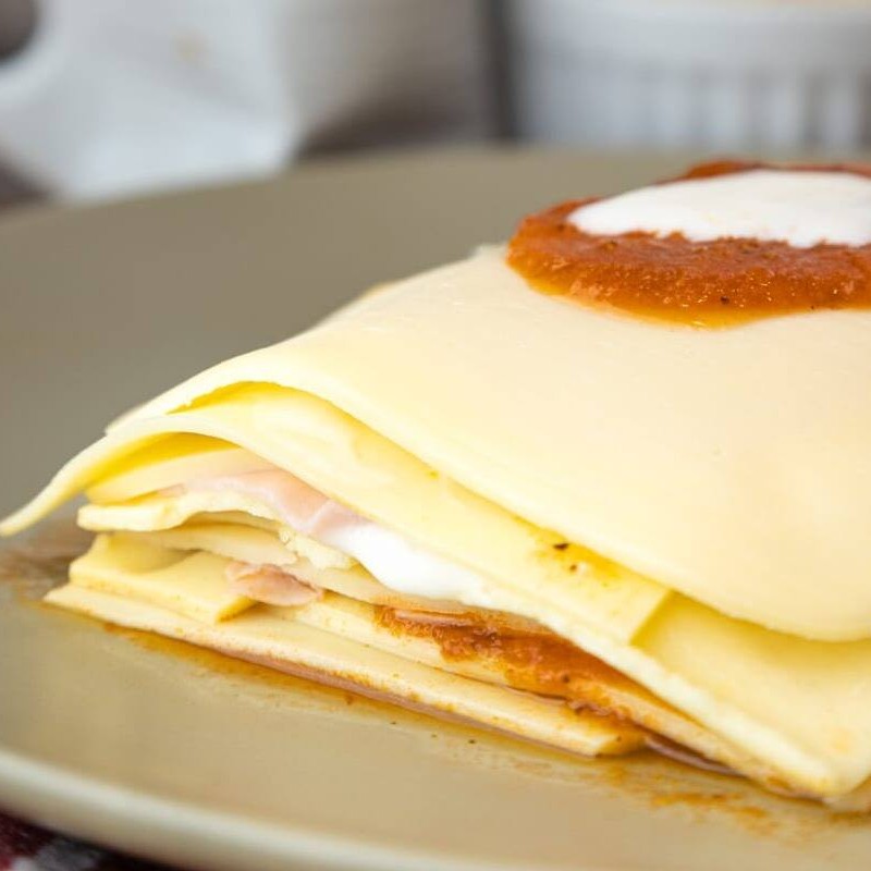 Massa fina de panqueca, recheado com carne moída e Catupiry, cobertura de molho de tomate artesanal, finalizado com parmesão ralado. 4 unidade de panquecas. Embalagem para forno 25 minutos, 180 Pode tirar da embalagem e aquecer em micro. Serve 2 à 3 pessoas.