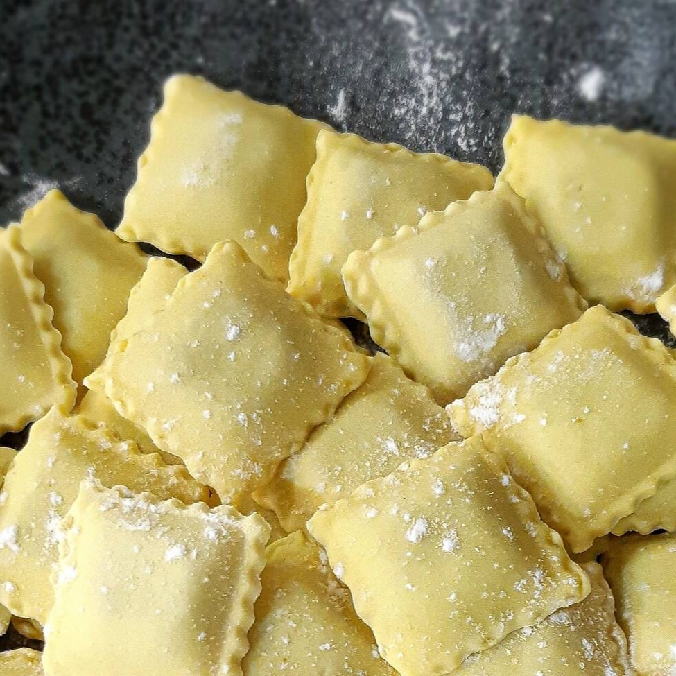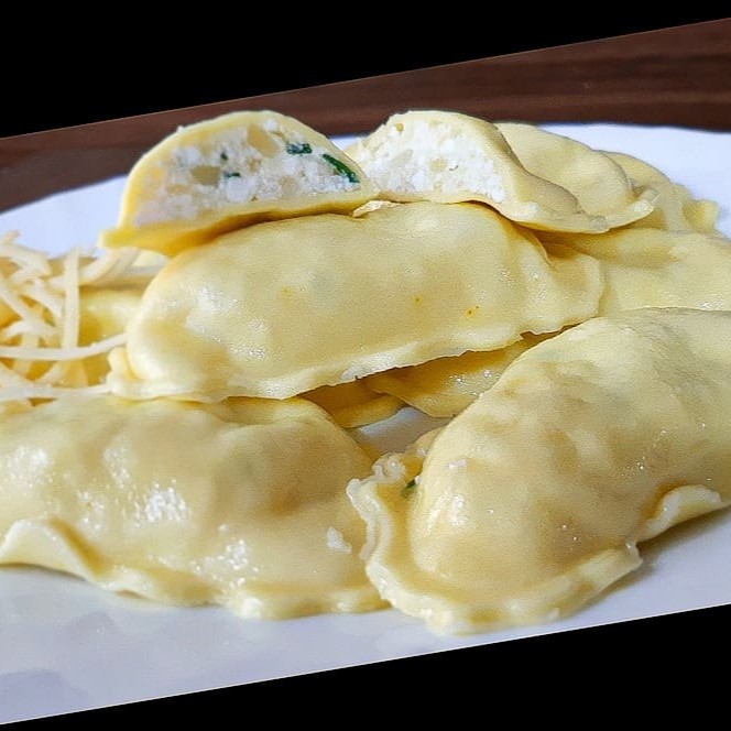 Massa artesanal, raviolli recheado com carne moída, Catupiry e parmesão ralado. Produto congelado, para cozinhar em casa em água fervendo por 6 minutos. Não acompanha molho. Cada pacote tem 500g, serve até 3 pessoas.