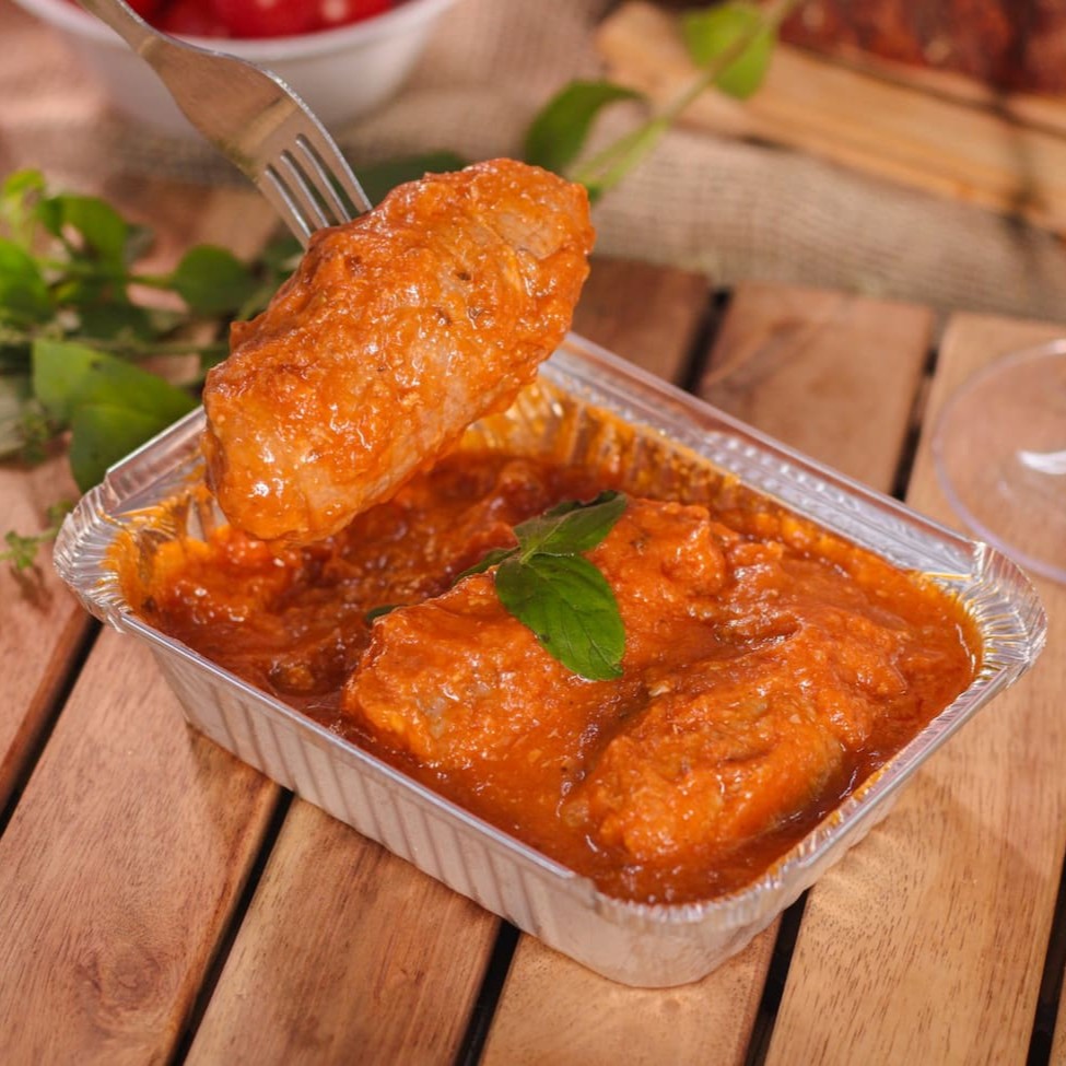 Bife posta vermelha de Angus, recheado com bacon, cenoura e calabresa, molho artesanal. Embalagem de 500g vem em media de 3 a 4 pedaços. serve 2 pessoa.