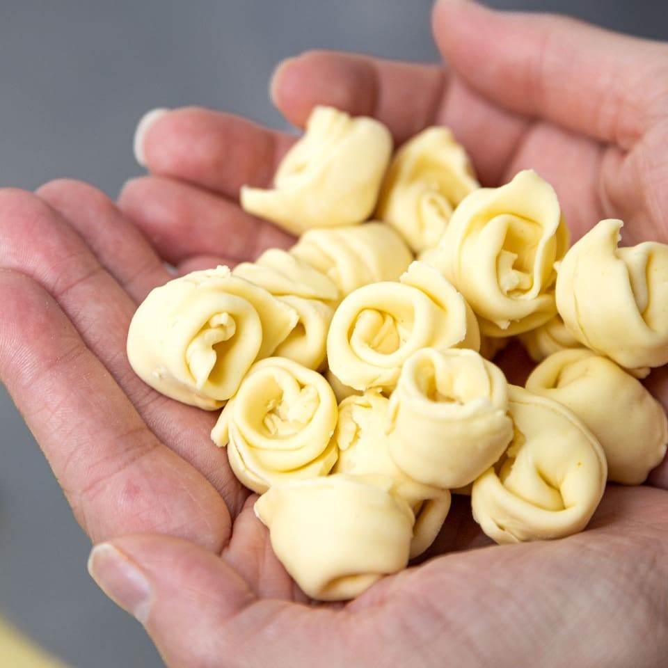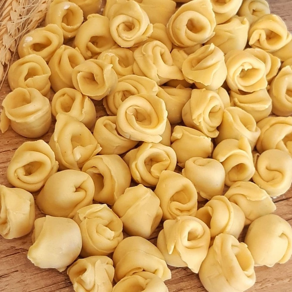 Massa artesanal de agnolini de frango, produto enrolado na mão um à um. Perfeito para sopas ou brodos. Produto congelado, para cozinhar em casa em água fervendo por 6 minutos. Cada pacote tem 500g, serve até 4 pessoas em sopa.