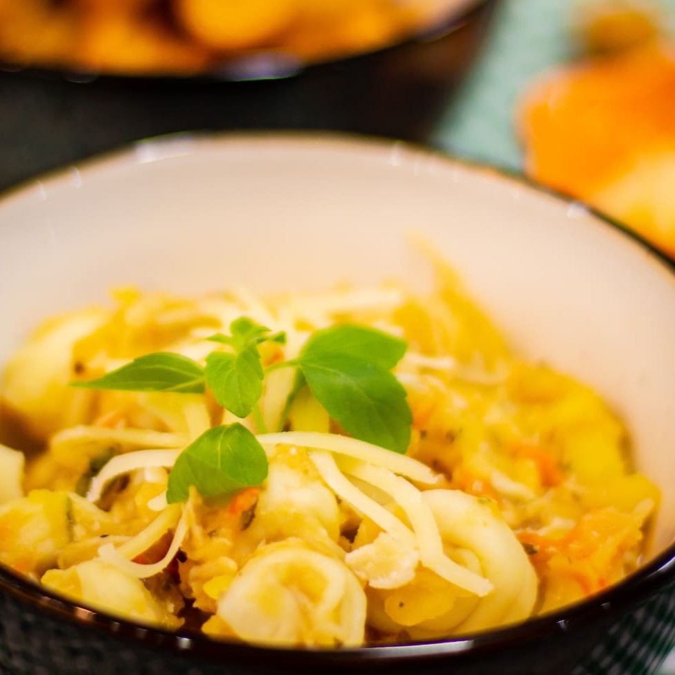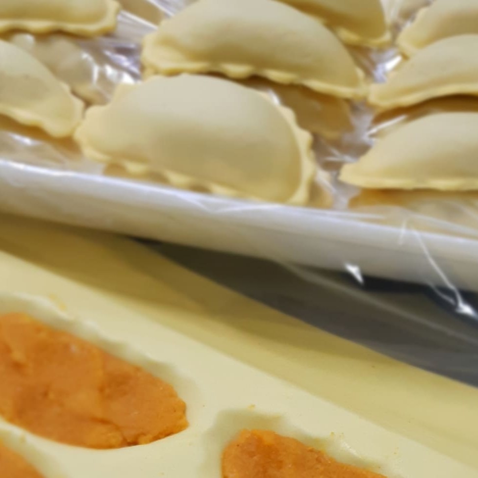 Massa artesanal cozida congelada, recheio abobora cabotiá, queijo parmesão, canela, açúcar. Produto congelado, não precisa cozinhar já está cozido. Não acompanha molho. Cada pacote tem 500g, serve até 3 pessoas.