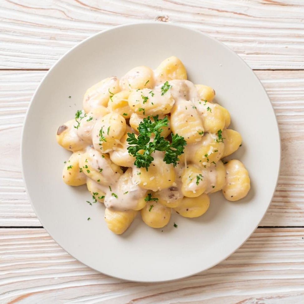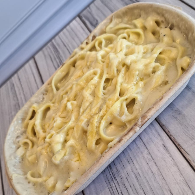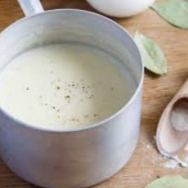 Molho cremoso, com temperos noz moscada, pimenta do reino, queijo parmesão, nata.