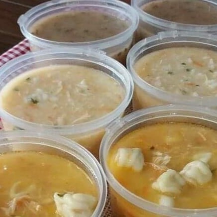 Sopa de canja, arroz, frango desfiado, cenoura ralada, salsinha. Porção em torno de 500g Embalagem vai no micro ondas. Congelada, conforme disponibilidade enviamos fresca.