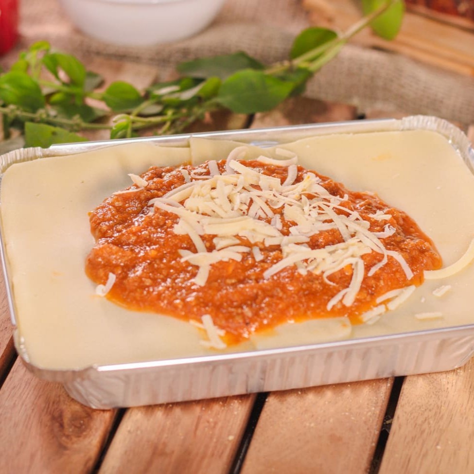 Lasanha Bolonhesa, com 500g. Massa artesanal com molho de tomate caseiro e recheada com uma suculenta carne moída, queijo mussarela fatiado e parmesão ralado. A embalagem para o forno e fica pronta em apenas 25 minutos a 180º. Se preferir, você pode retirá-la da embalagem e aquecer no micro-ondas por 6 minutos. Este prato serve 3 pessoas.