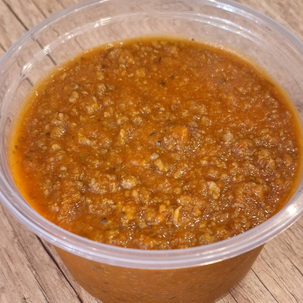 Molho frio, para aquecer, embalagem vai no micro. Molho de artesanal base de tomate com carne moída. pote com 500g