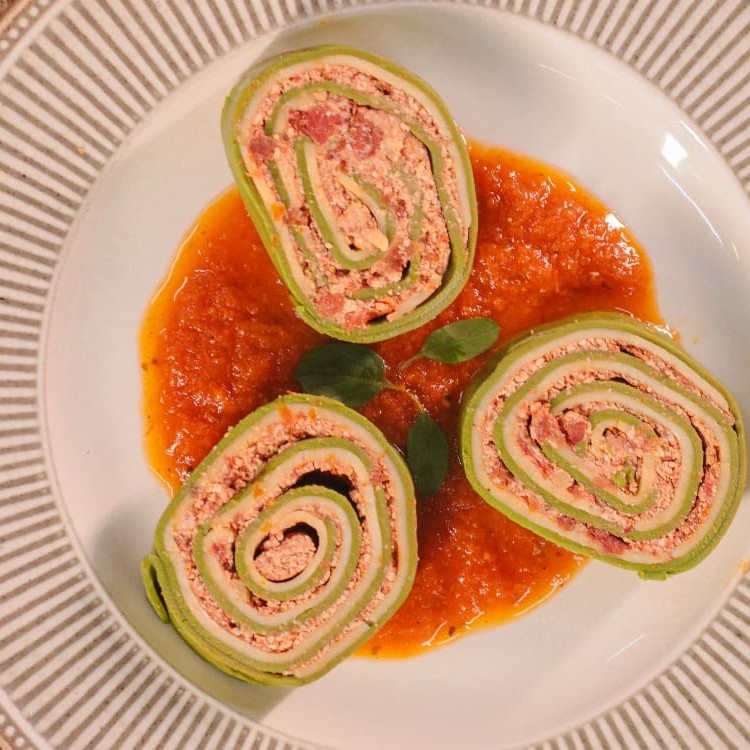 Massa artesanal de espinafre, enrolada com recheio tomate seco com ricota, com molho artesanal ao sugo. Finalizada com queijo parmesão ralado. Embalagem para forno 25 minutos, 180 Pode tirar da embalagem e aquecer em micro. 3 fatias de rondelli, aproximadamente 800/1kg Serve 2 à 3 pessoas.
