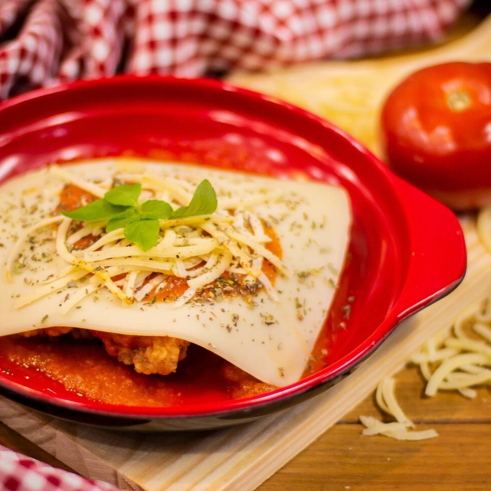 Filé de frango milanesa à parmegiana, molho artesanal, queijo mussarela, orégano e parmesão ralado. Em media 500g, vem 4 pedaços pequenos de bifes.
